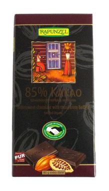 Exkluzívne tenká extra horká čokoláda s veľmi vysokým obsahom kakaa 85%, najvyšším podielom kakaa z výberových Rapunzel čokolád. Čokoláda je vyrábaná tradičným postupom v Švajčiarsku a na jej výrobu bolo použité kakao z Bolívie a prírodný trstinový cukor Cristallino.