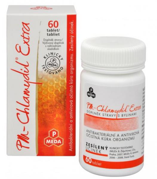 PM Chlanydyl Extra: prírodné extrakty v prípravku majú charakter zosilnenej očistnej kúry od širokého spektra nežiaducich baktérií a vírusov v ľudskom organizme. Nežiaduce mikroorganizmy sú napríklad chlamýdie, borélie, chrípkové vírusy, :Candida atď. Bezpečnosť a účinnosť bola klinicky overená u chlamýdií a borelií. Zloženie v 1 tablete 900mg: mikrokryštalická celulóza (plnidlo), extrakty (výťažky z bylín) túžobník brestový (Filipendula ulmaria), Vŕbovka (Salix alba) a jelšová (Alnus glutinosa), kôra extrakt v pomere 9:1:1 127,5 mg, Lapač extrakt (Tabebuia serratifolia) 82 mg, Bacopa monieri 35mg, Hydroxypropyl metylcelulóza (stabilizátor), Mačací pazúr (Uncaria Tomentosa) extrakt 10mg, Propolis Moravia PM 8,3mg, Stearan Horečnatý rastlinný (protihrudkujúca látka), Selénové kvasnice - Selen 50 μ (91% denné referenčné výživové hodnoty). 15 dní pri poštípaní kliešťom a chrípkovom víruse. Ostatné mikroorganizmy 30 - 90 dní. Prípravok je určený na dlhodobé použitie. Nie je určené pre deti, tehotné a dojčiace ženy. Nevhodné pre osoby citlivé na včelie produkty. Obsah: 60tbl / 54g Krajina pôvodu: ČR