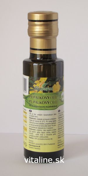 Púpalkový olej BIO. 100% olej lisovaný za studena zo semien. Olej je bez umelých konzervačných látok a umelých farbív.