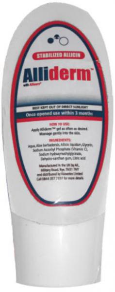 Stabilizovaný alicín ALLISURE® vo forme gélu. Antibakteriálny gél Výborný doplnok k AllliMax-u na vonkajšie použitie. Kozmetický prípravok. Alliderm Gél (AlliGel) sa môže aplikovať tak často, ako vyžadované, ale najmenej raz denne, na postihnutú oblasť. Môže sa tiež pridať na náplasť.